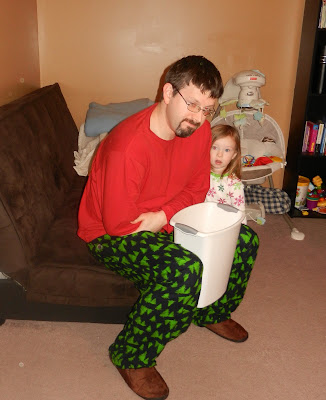 Daddy came down, trash can in hand (and was definitely not saying "I'm going to be mad if that picture ends up on the blog" as I was taking this picture) because no way was he going to miss his babies opening their presents.